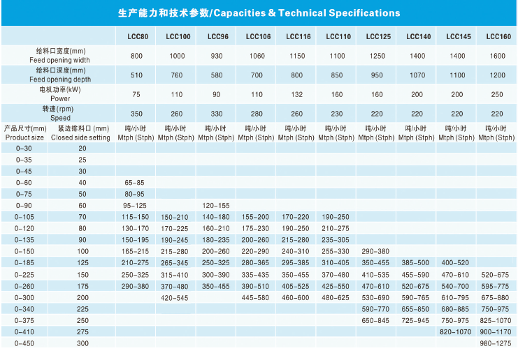 以上數據所表示的破碎機產量,是針對平均比重為 2.7t/m 3 ,給料能夠順利進入破碎腔、無架橋卡堵現象,給料剔除小于排礦口細料時取小值,含細料時取大值。產量可能隨給料方式和物料性質諸如粒度組成、含水含泥量、松散密度和可碎性而變化。