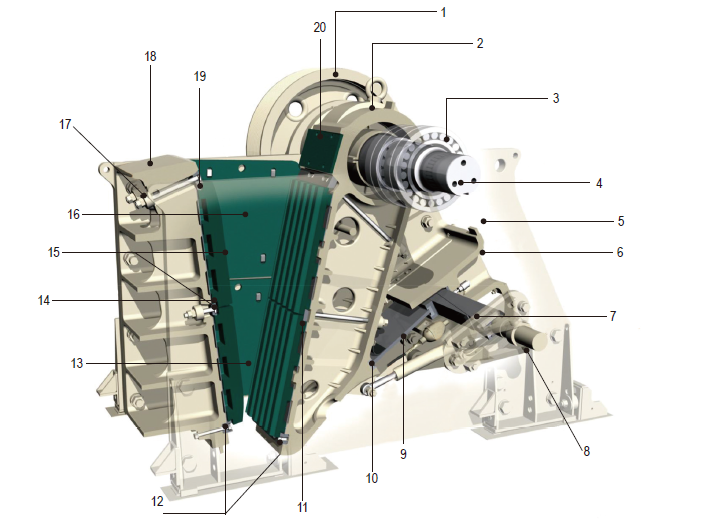 LCC 系列顎式破碎機都裝備有雙楔塊排礦口調整系統,其堅固且調整快捷的優勢在行業內已經得到證明,該系統在對于由于供電中斷導致系統帶負載停機而需要清腔時尤其有效;橡膠減震裝置和限位塊可以吸收震動峰值載荷,并允許破碎機垂直和縱向位移,從而有效地降低破碎機對基礎的沖擊;電機機座與破碎機機架一體安裝,減少了破碎機安裝空間和 V 形帶的長度。